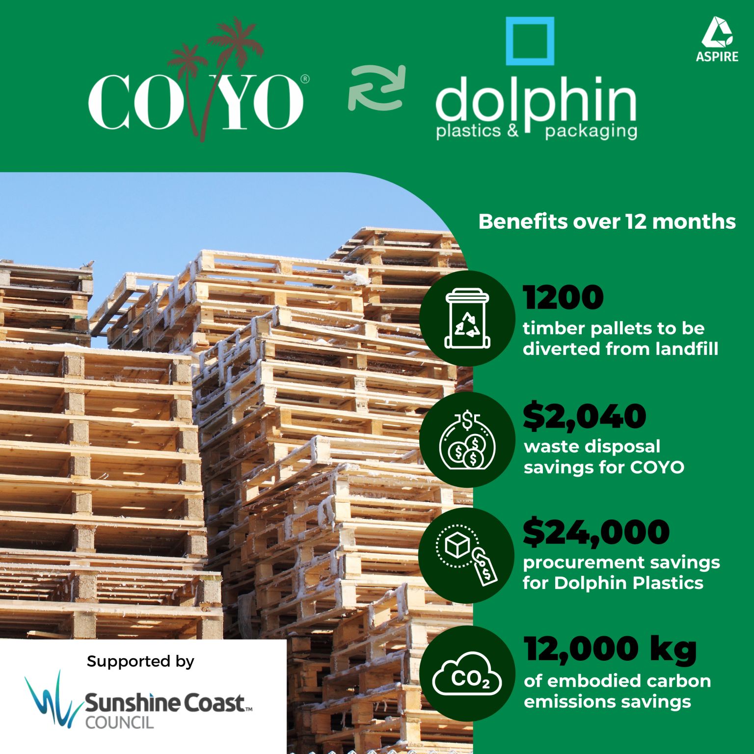 Around 70% of timber waste ends up in landfill, this includes timber pallets. It’s a hassle for businesses to dispose of timber pallets because they are bulky. Local business COYO exchanges their timber pallets with Dolphin Plastics via Aspire to generate cost and carbon savings. In turn Dolphin Plastics uses the pallets for redistribution of their product. This creates a sustainable cycling loop.