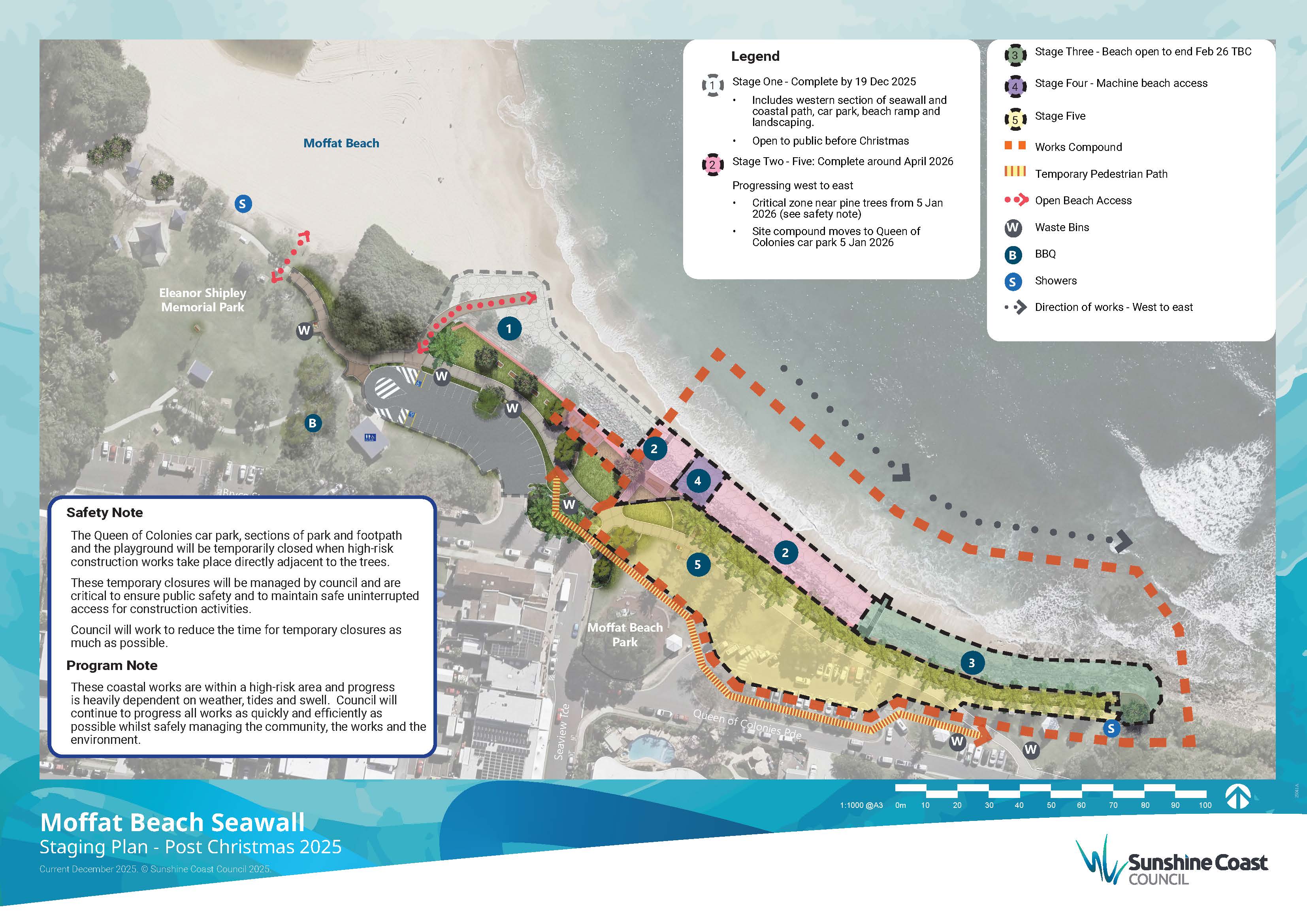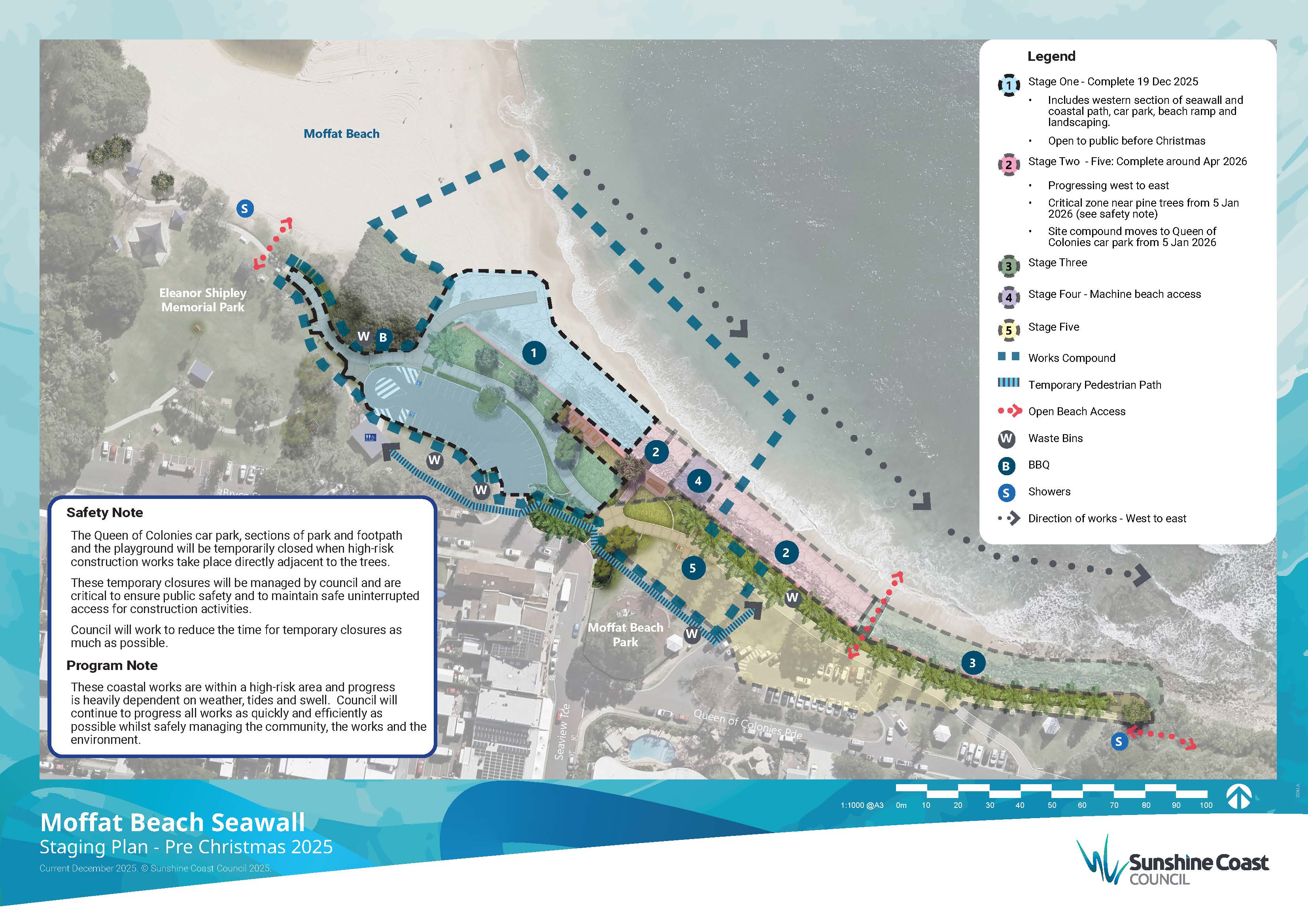 Work on the Moffat Beach seawall reconstruction, which began on 19 May 2025, is progressing steadily and we thank you for your continued support and patience. This vital work will help protect and preserve this much-loved local area for future generations.