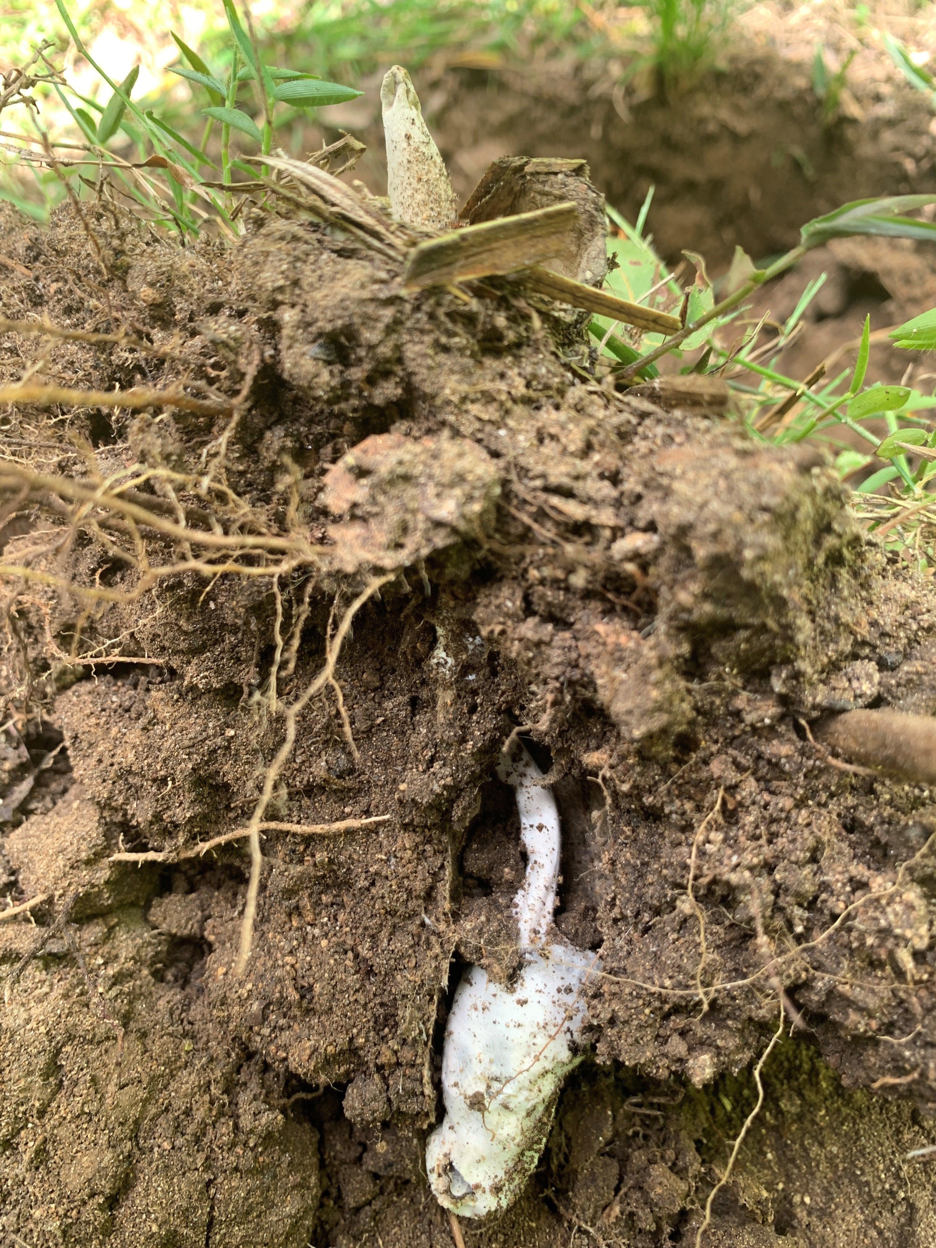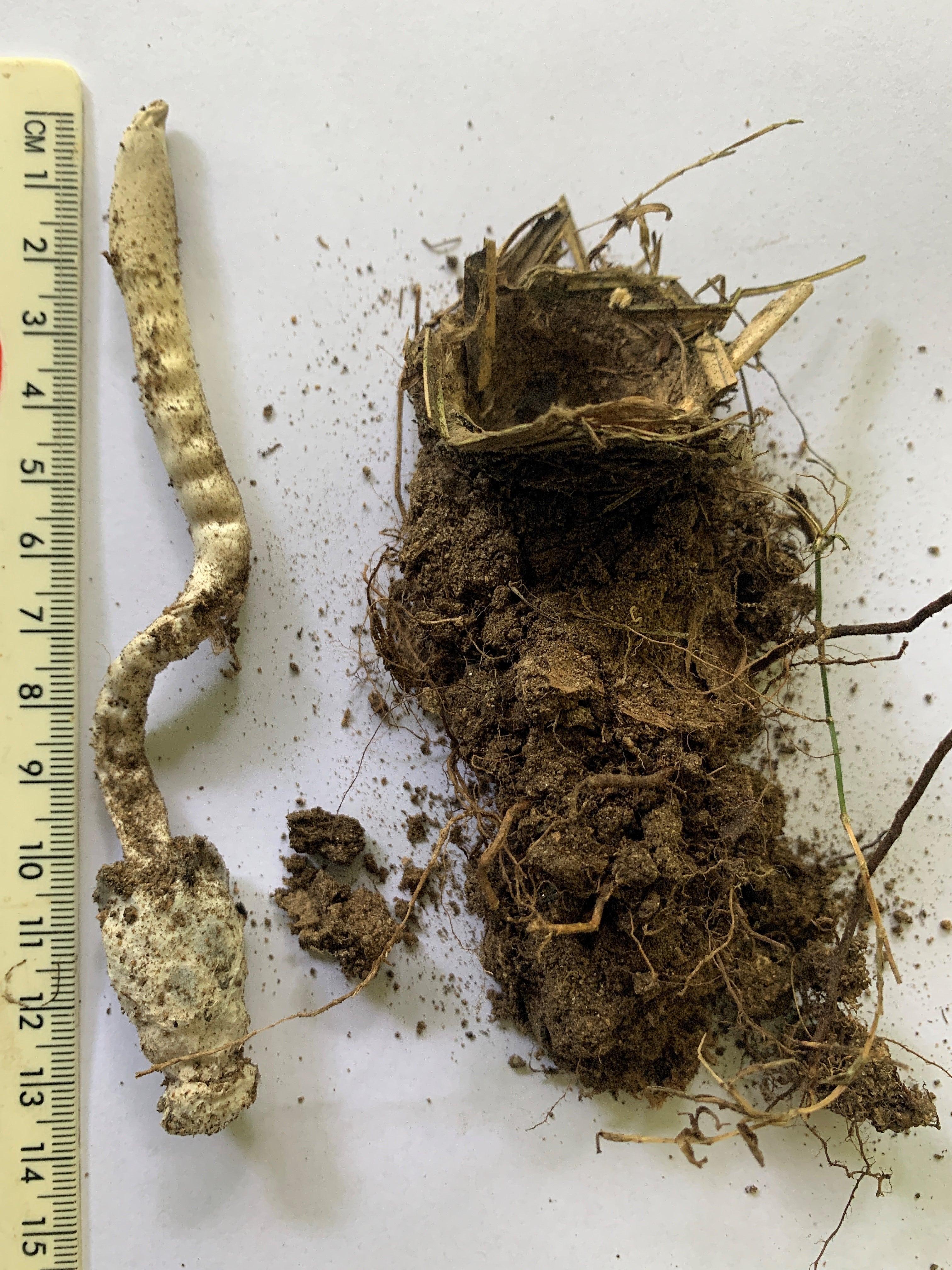 Over the weeks following my discovery I searched the surrounding area and was unable to find any other similar burrows with the distinctive trapdoor lid but they are well camouflaged so I may have just not seen them. You can imagine my intrigue when I noticed a fungal fruiting body emerging. As it was so unusual I decided to return with some digging tools and excavate the spider/fungus from its burrow to learn more about its fate. I discovered the poor spider encased in fungal hyphae and the fruiting body of what I think is a species of Cordyceps fungi.