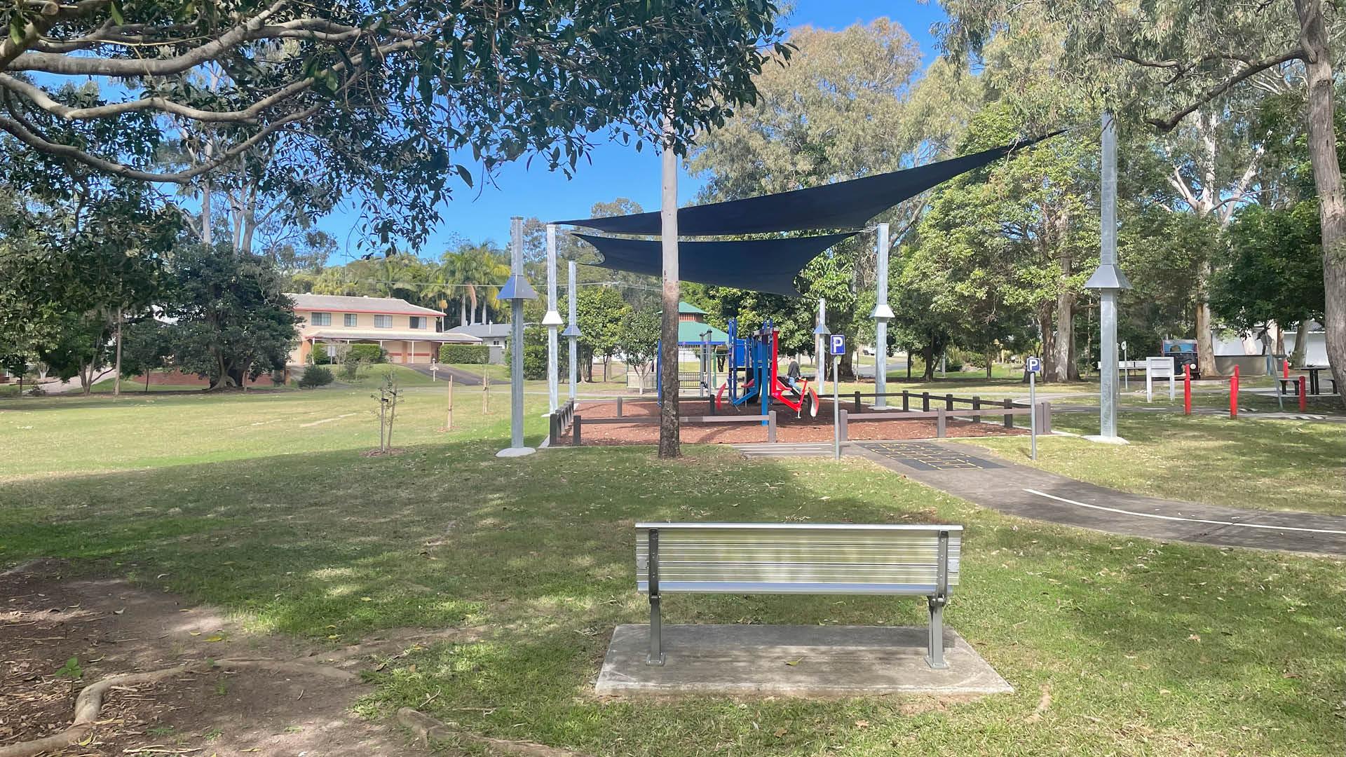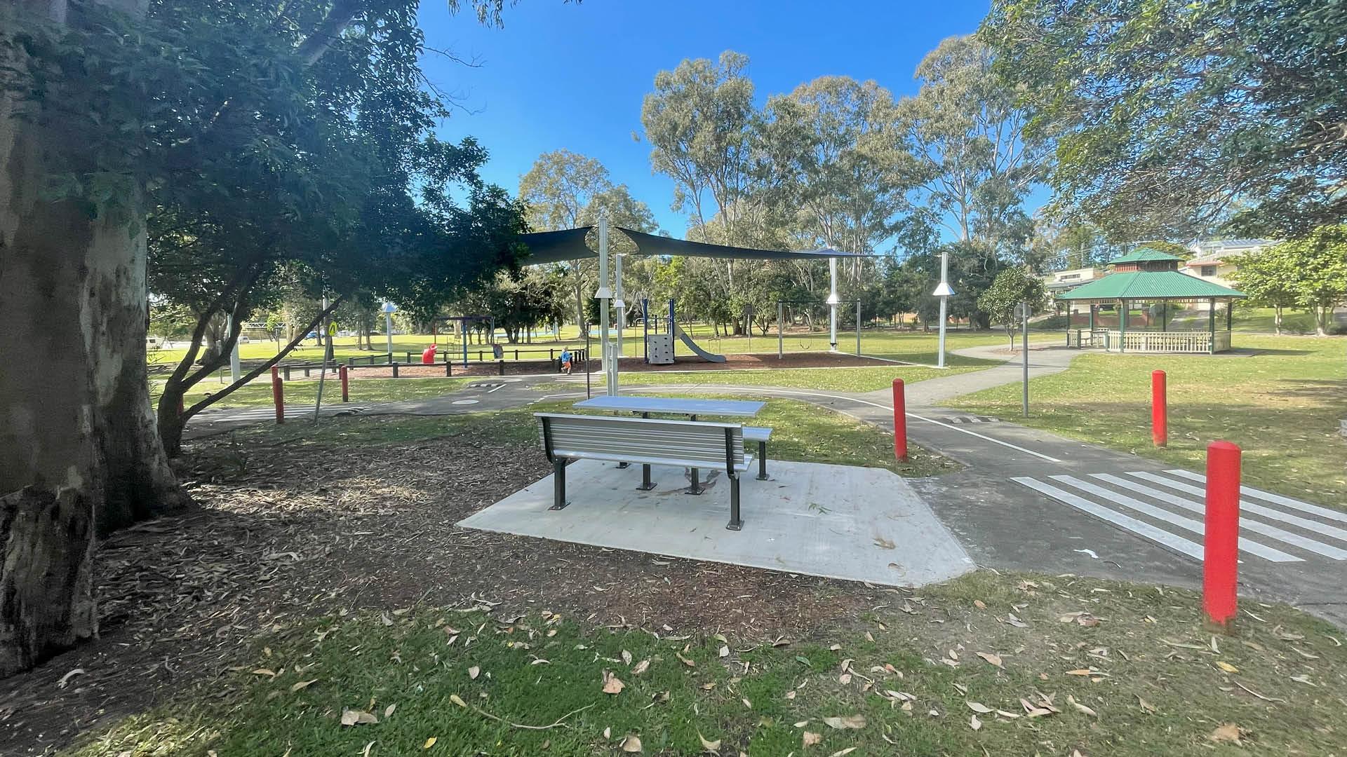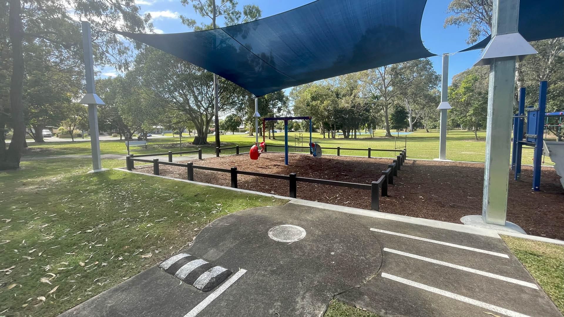 The park provides a kids education track equipped with road line markings and road signs to help set the scene for an exciting junior road experience. The shaded playground has elements spaced out creating separate play areas which can cater for many individual groups at any one time.