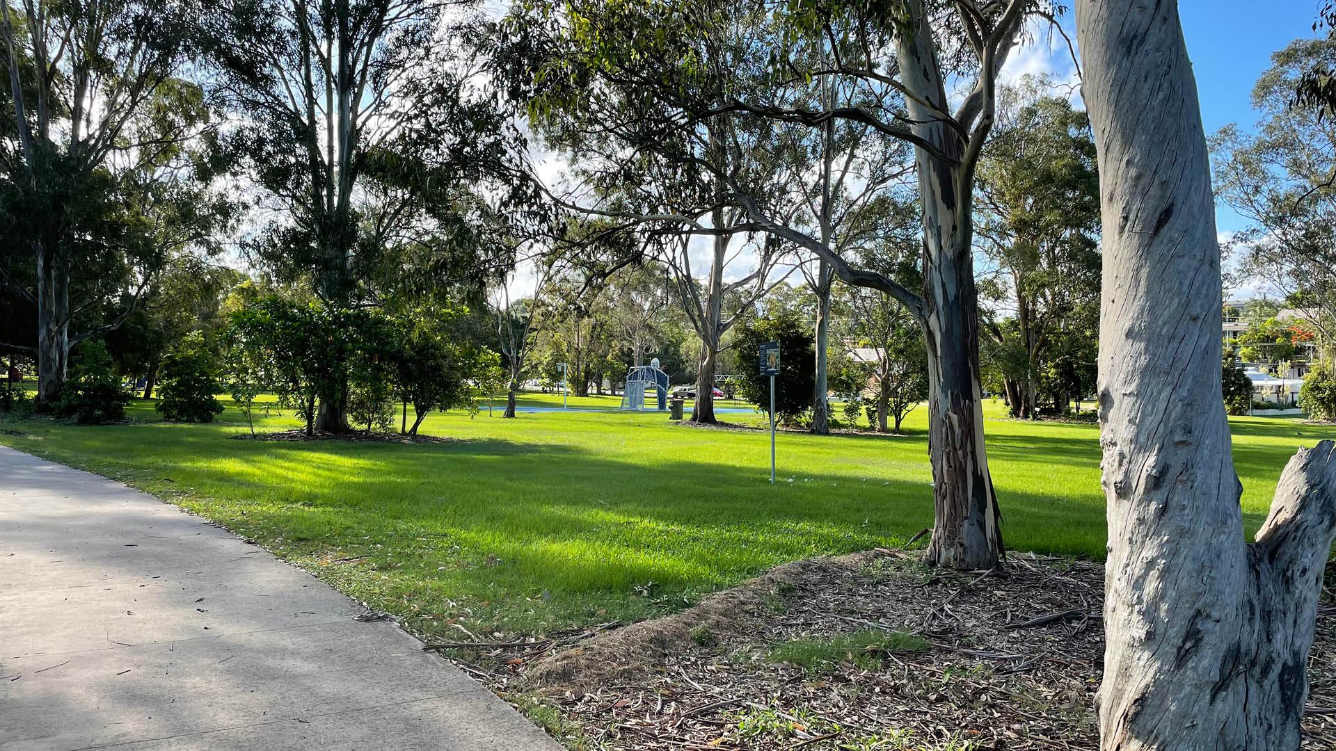 This 2.8 hectare district park has a lot on offer. It provides a shelter, a playground, half basketball court, kids education bike track, a cricket pitch as well as plenty of open kick about areas with scattered natural shade