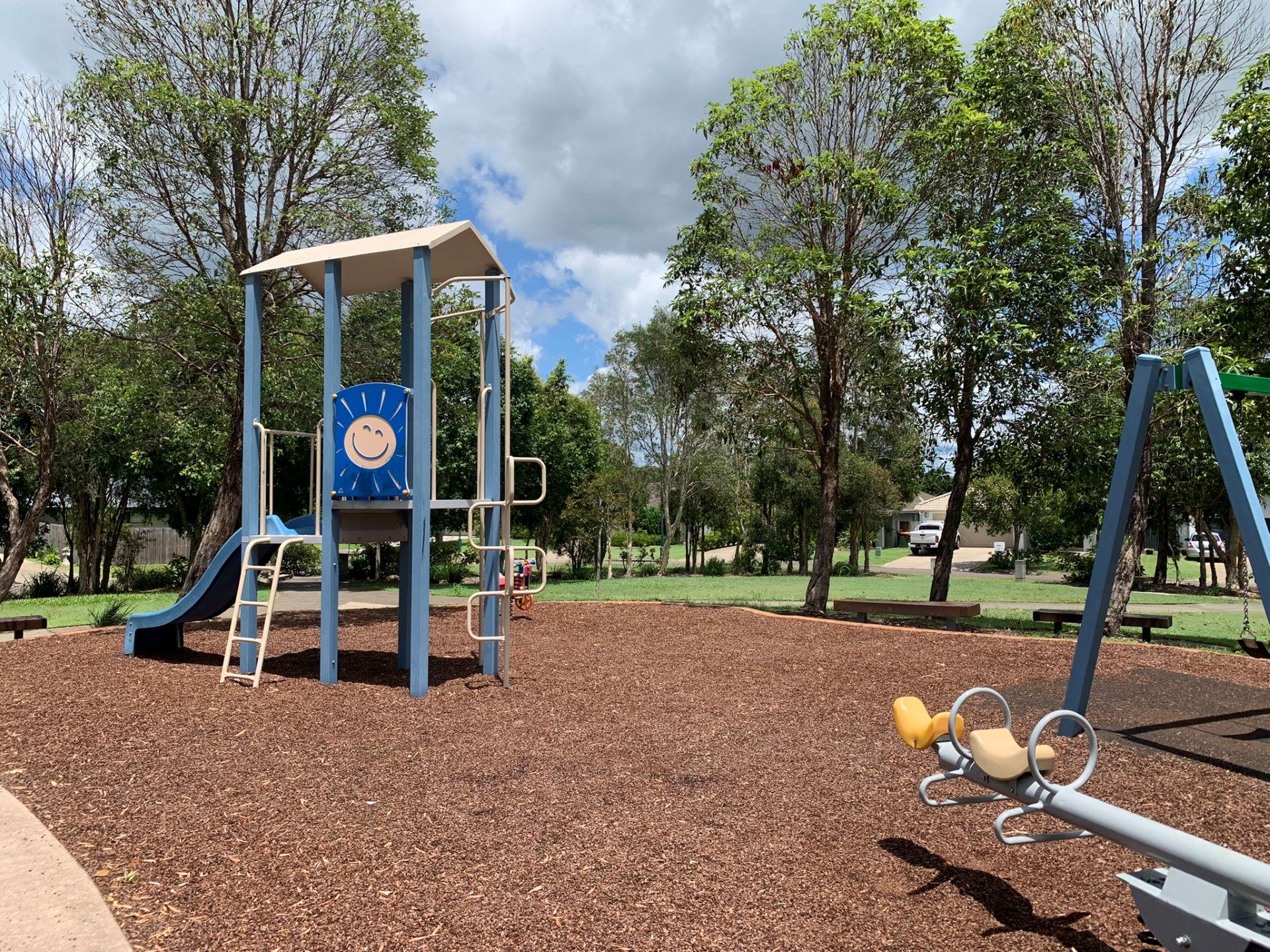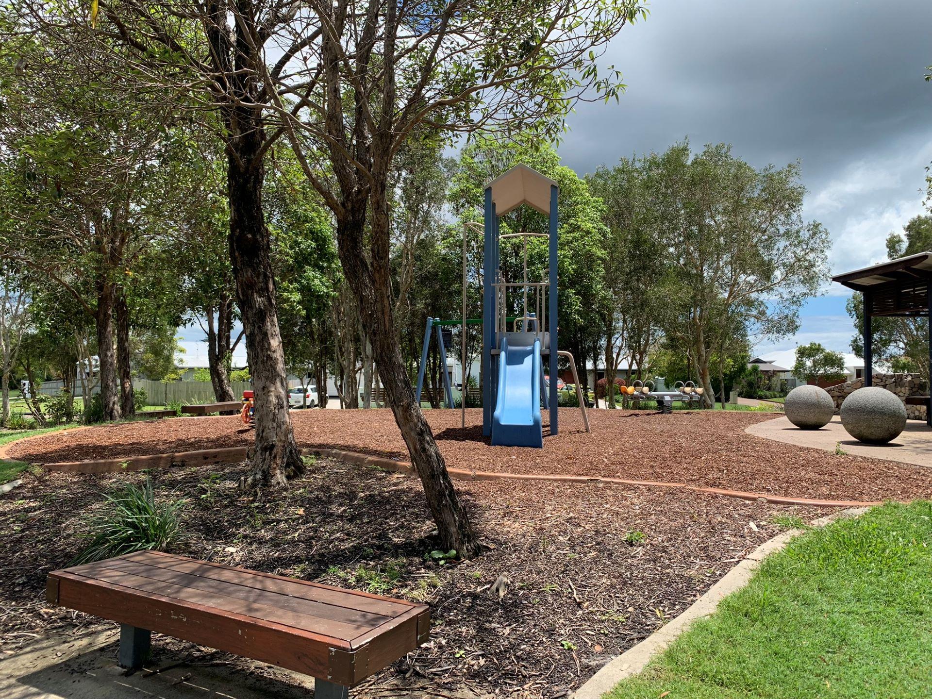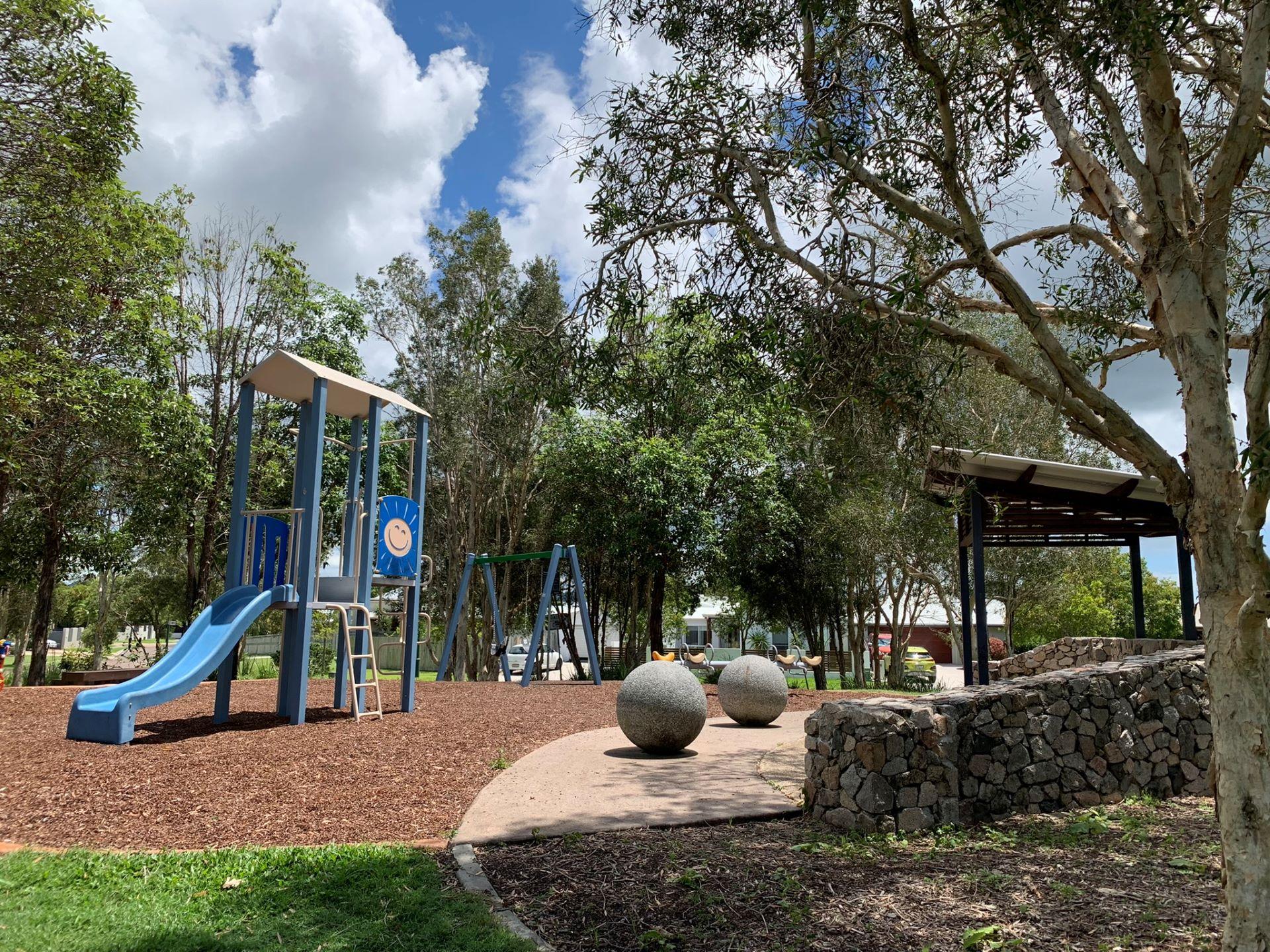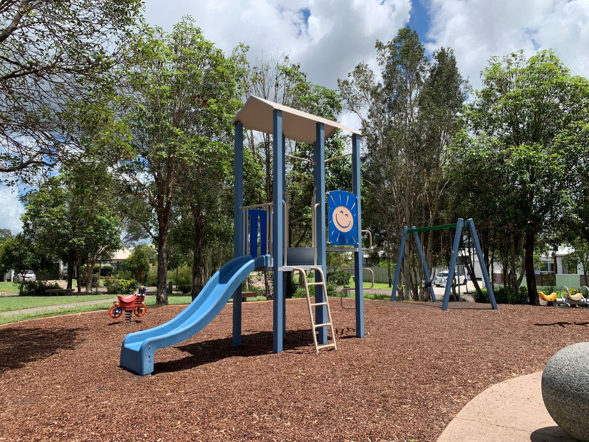 This park provides connecting pathways to a playground under natural shade, a picnic shelter and large open grassed areas for kick and throw activities