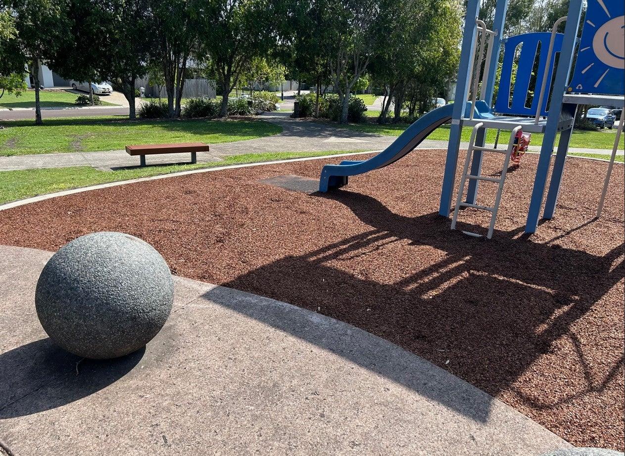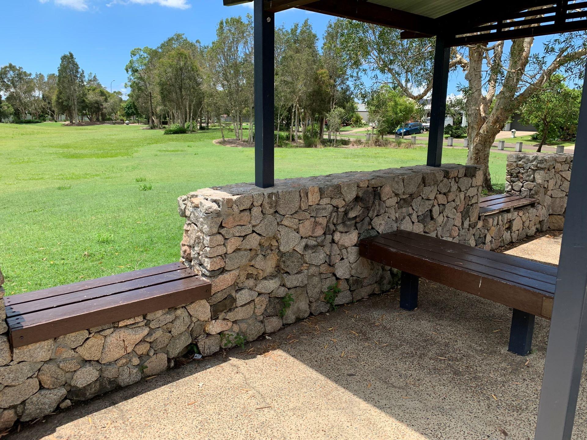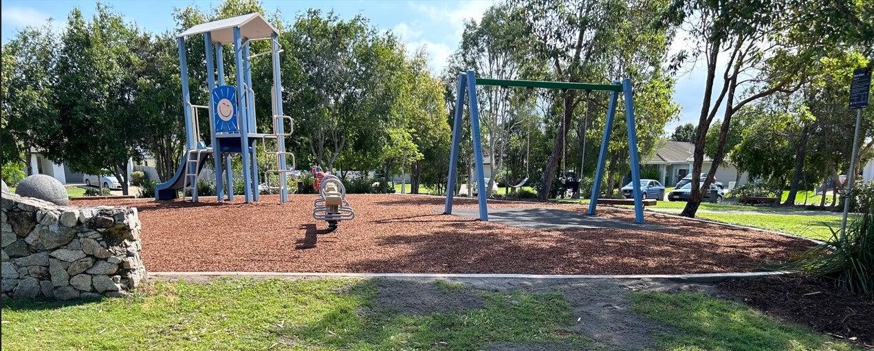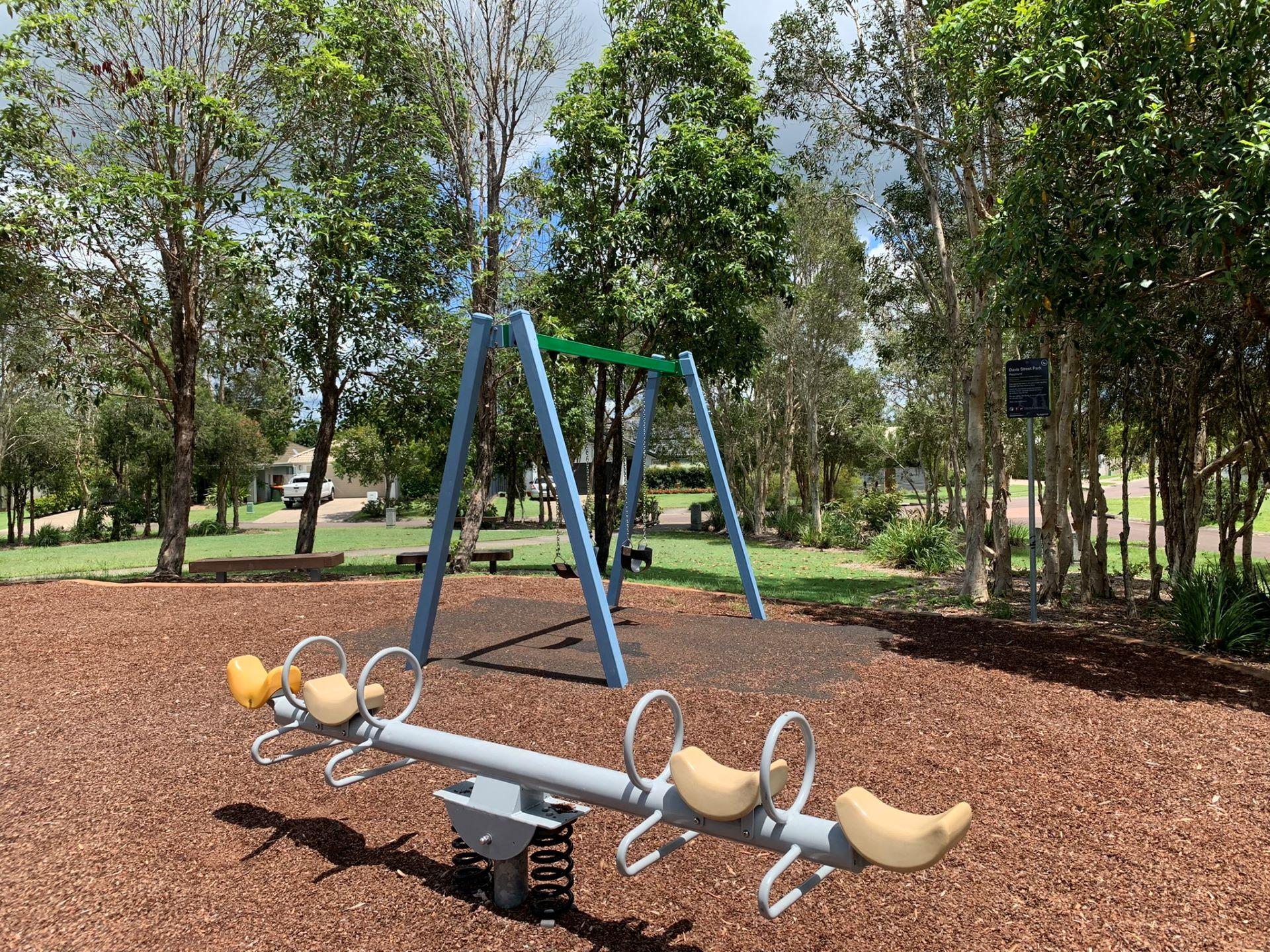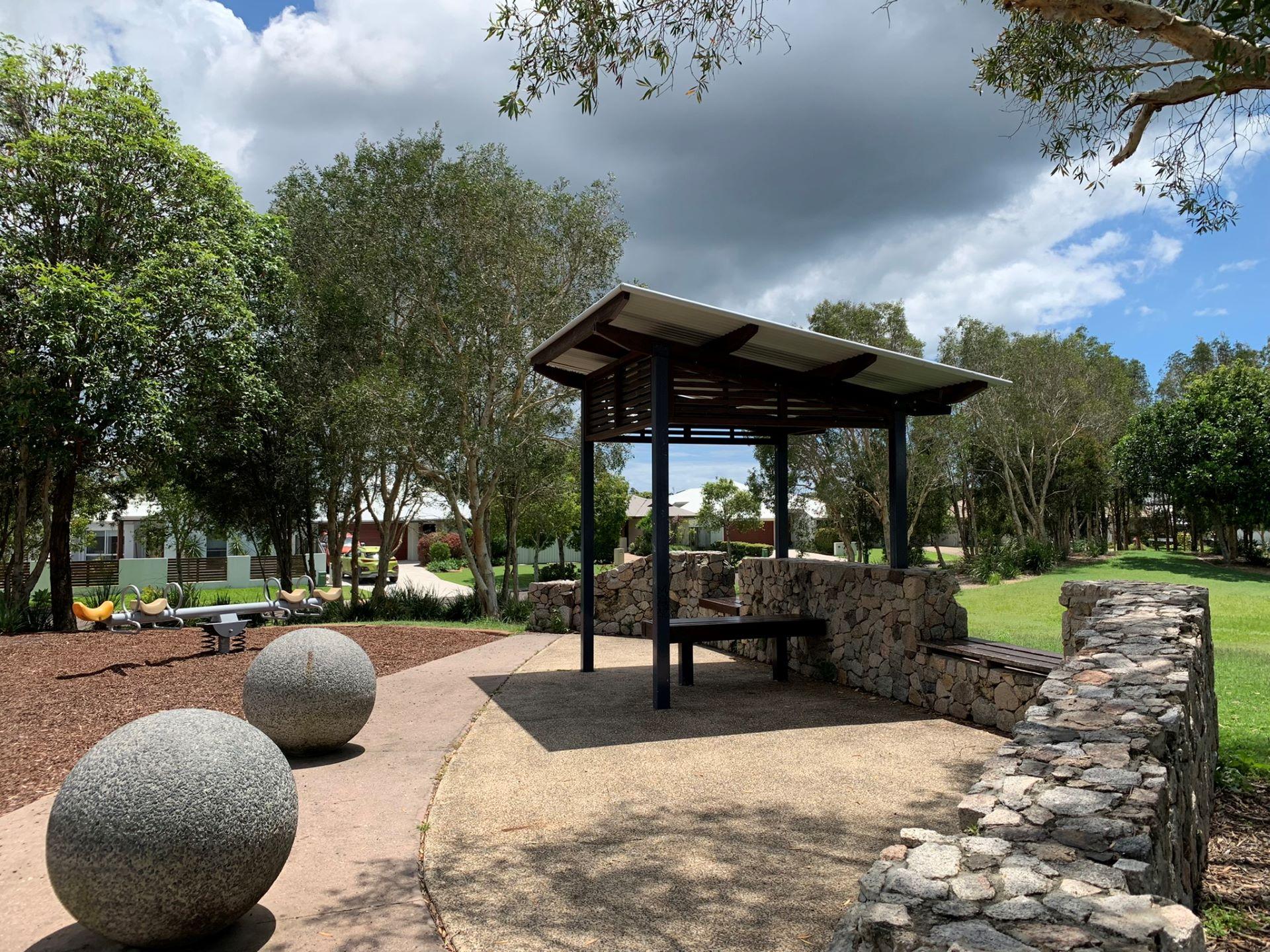 This park provides connecting pathways to a playground under natural shade, a picnic shelter and large open grassed areas for kick and throw activities