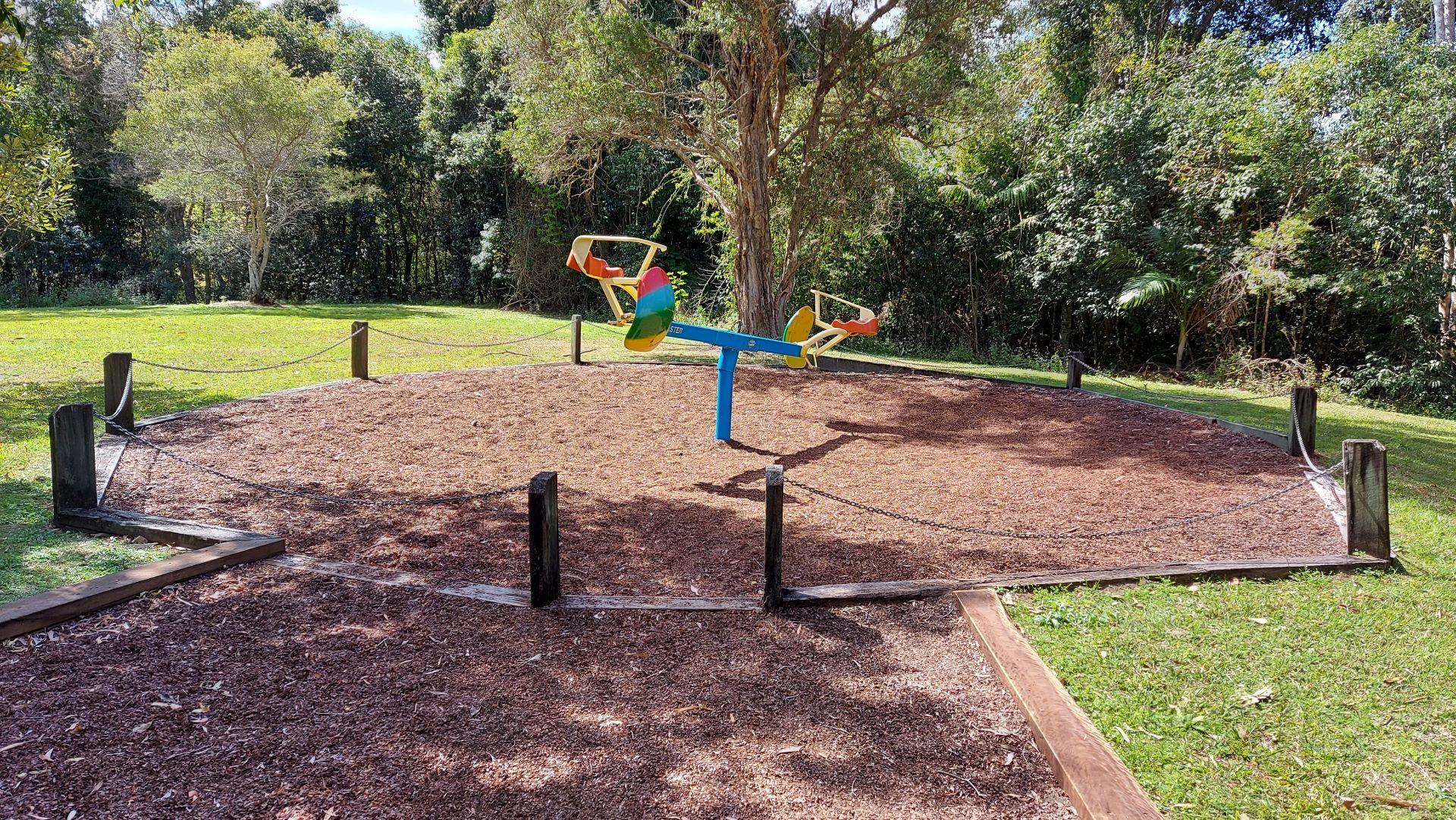 A large park with a connecting pathway, large grassed areas for kick and throw activities, a shelter with picnic table, playground, a flying fox and a half basketball court. There is also plenty of natural shade