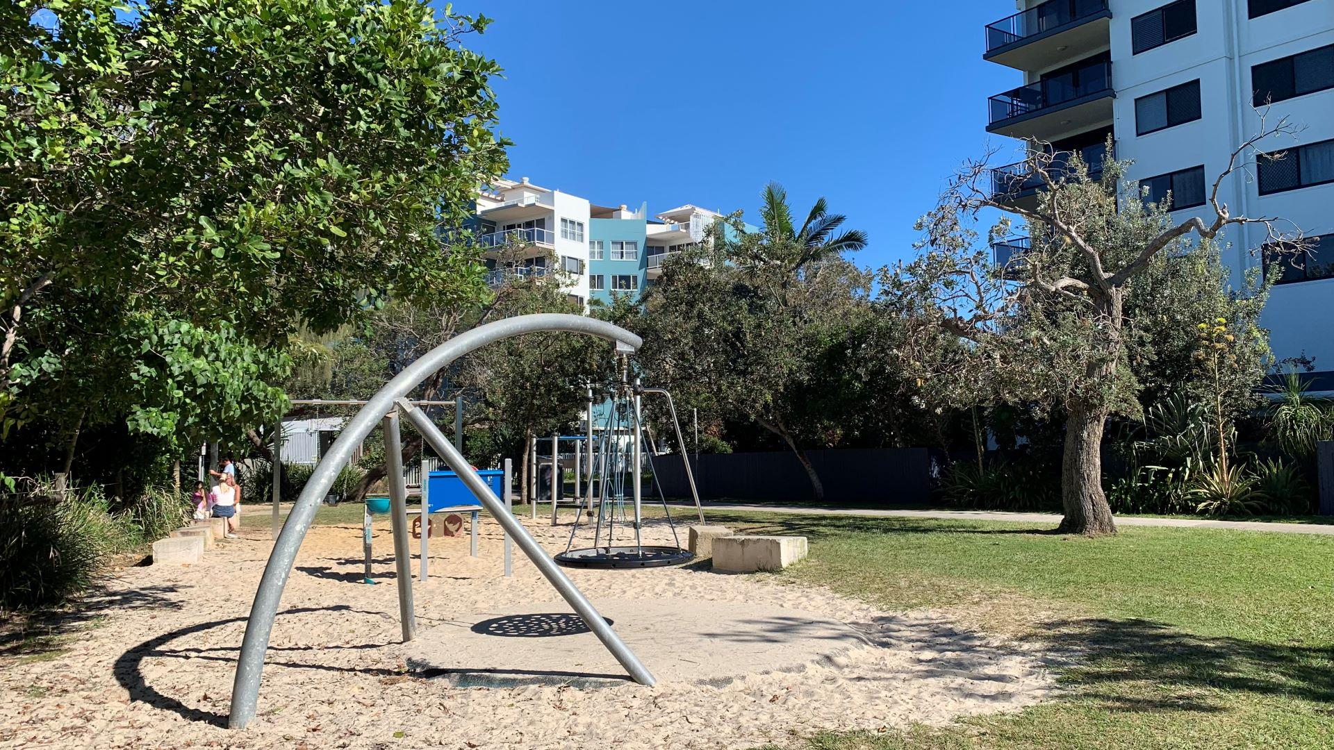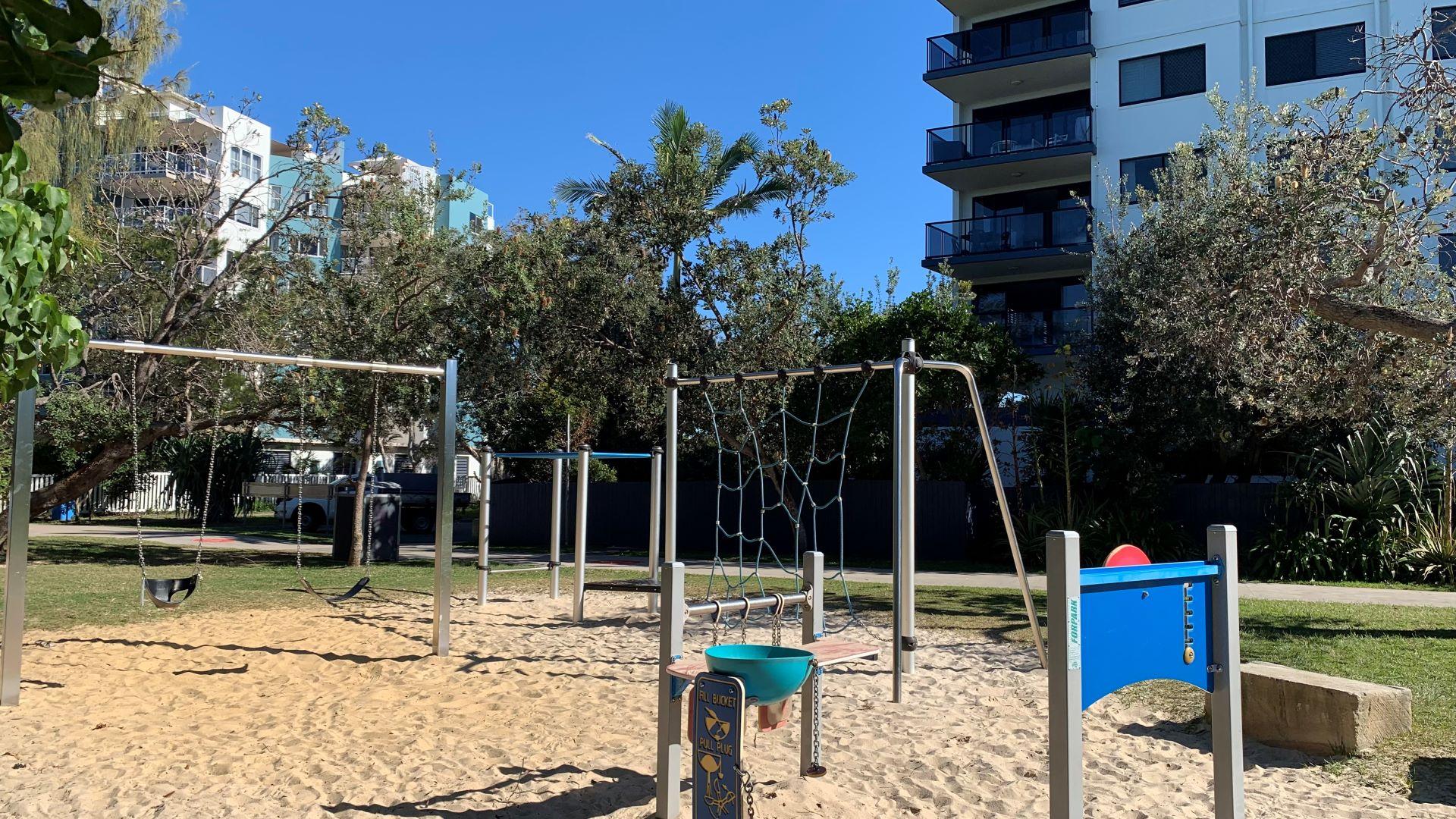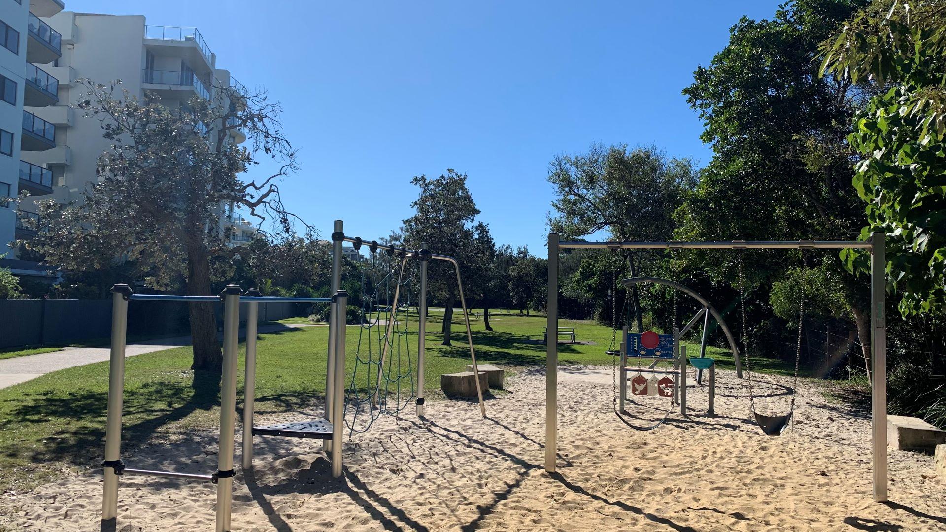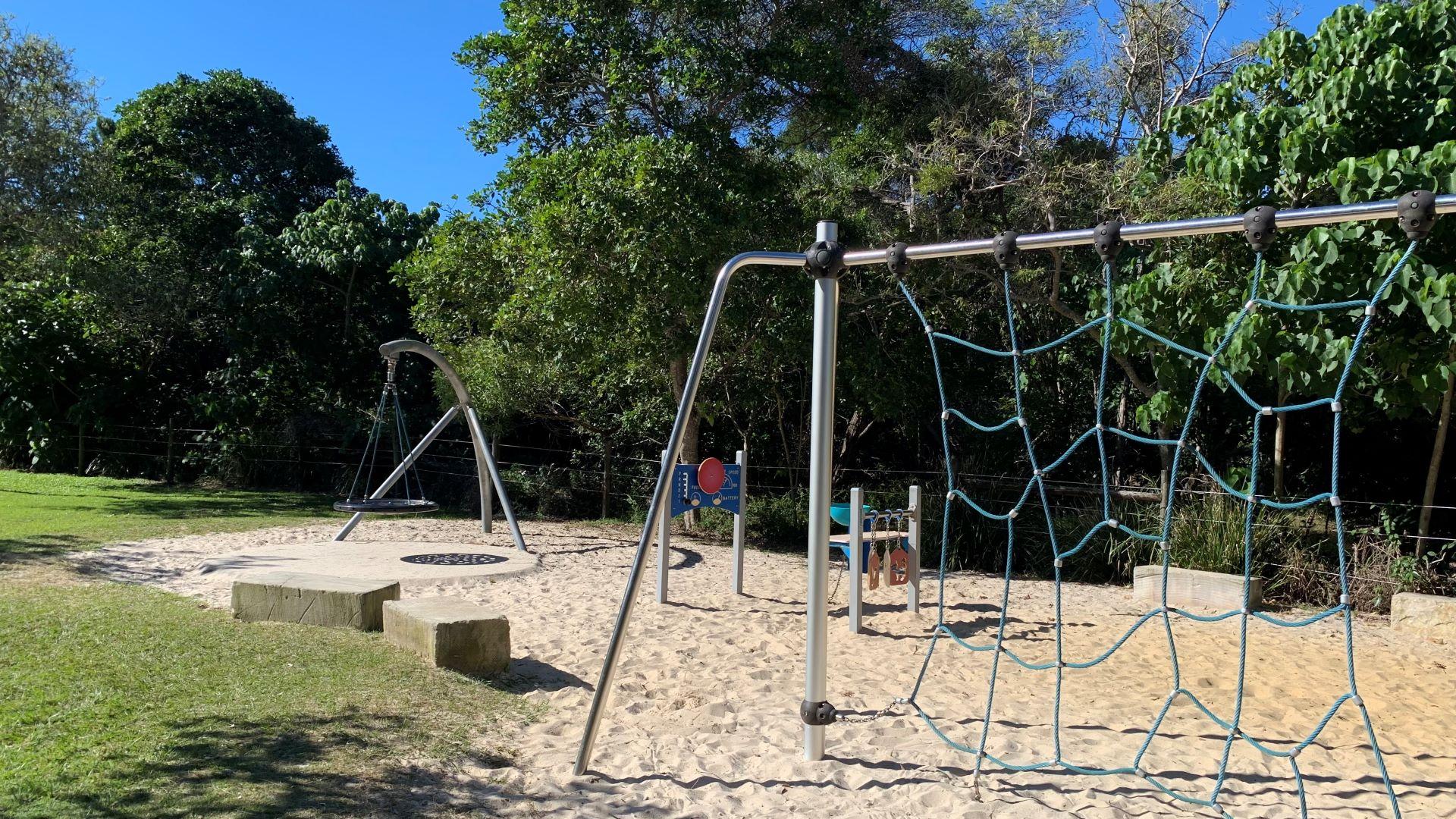 The park provides a playground with some natural shade, sandstone block seating, connecting pathways, two handball courts, beach access and access to public amenities